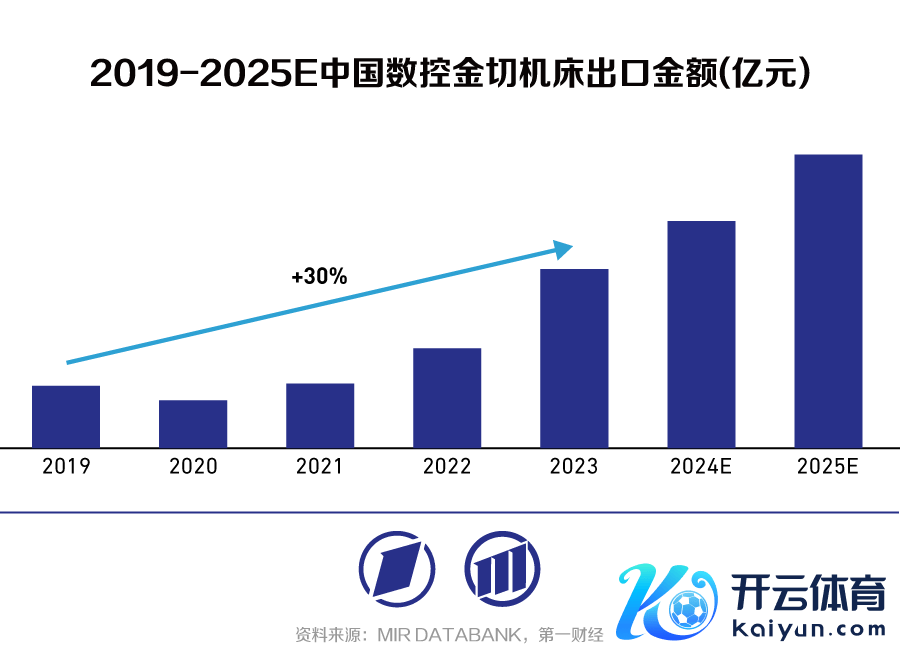 以金属切削机床为例(国度统计局只统计了金属切削机床),凭据MIR睿工业数据,连年来,我国金属切削机床为800亿~1100亿元,2023年约808亿元。2023年中国金切机床出口额达到119.5亿元,且2019年~2023年近五年的复合增长率达30%,展望2024年出口额将达到150亿元,2025年数字还将抓续增高。