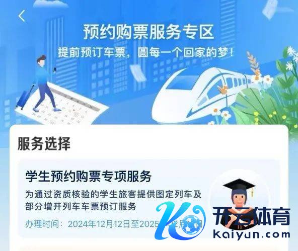 自12月12日起,铁路12306手机客户端开启学生预约购票劳动专区,同期优化转化学生优惠票发售和检察端正,适合条目的游客一又友可通过专区预约购买春运时辰往复车票体育游戏app平台,学生游客春运出即将愈加便利。