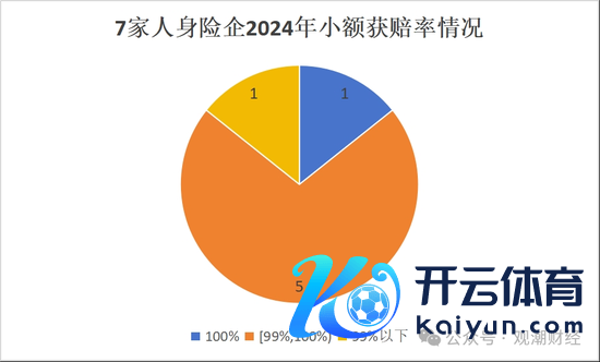 7家公布小额获赔率的险企中,1家小额获赔率达到100%,为国联东谈主寿。5家小额获赔率在99%以上,仅新华东谈主寿小额获赔率在99%以下,为98.51%。