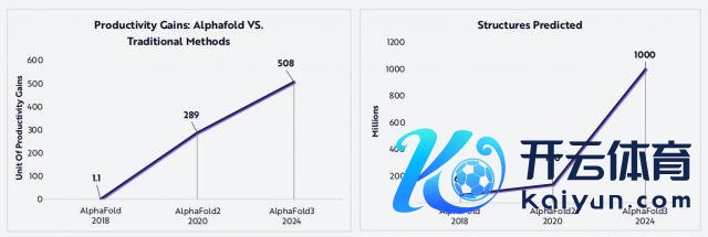 以 AlphaFold 为代表的 AI 模子,在卵白质结构预测方面赢得了迫害性进展,其着力是传统关节的 508 倍。最新版块 AlphaFold3 不错预测朝上 10 亿种结构,包括多链复合物、卵白质 - 配体、卵白质 -DNA/RNA 互相作用等。