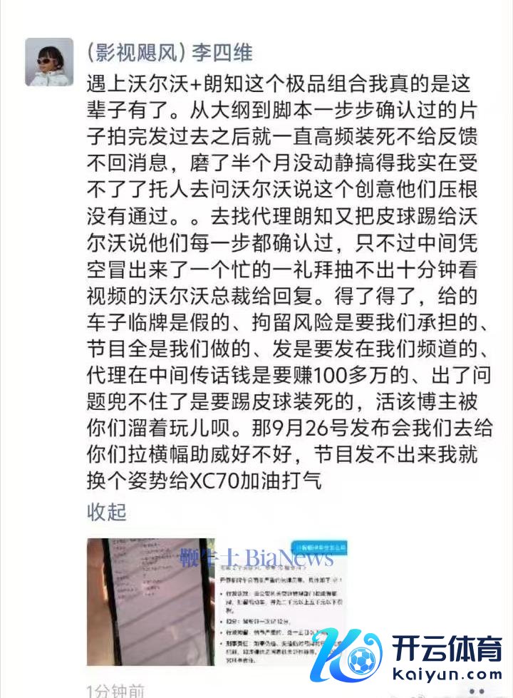 9月19日,网传截图炫耀,有影视飓风职工在一又友圈发文吐槽汽车过头公关代理公司朗知传媒,称拍好的创意片莫得通过,对方长久不给出响应,并泄漏试驾车提供的是假临牌、代理公司在中间寄语还要赚100多万等。