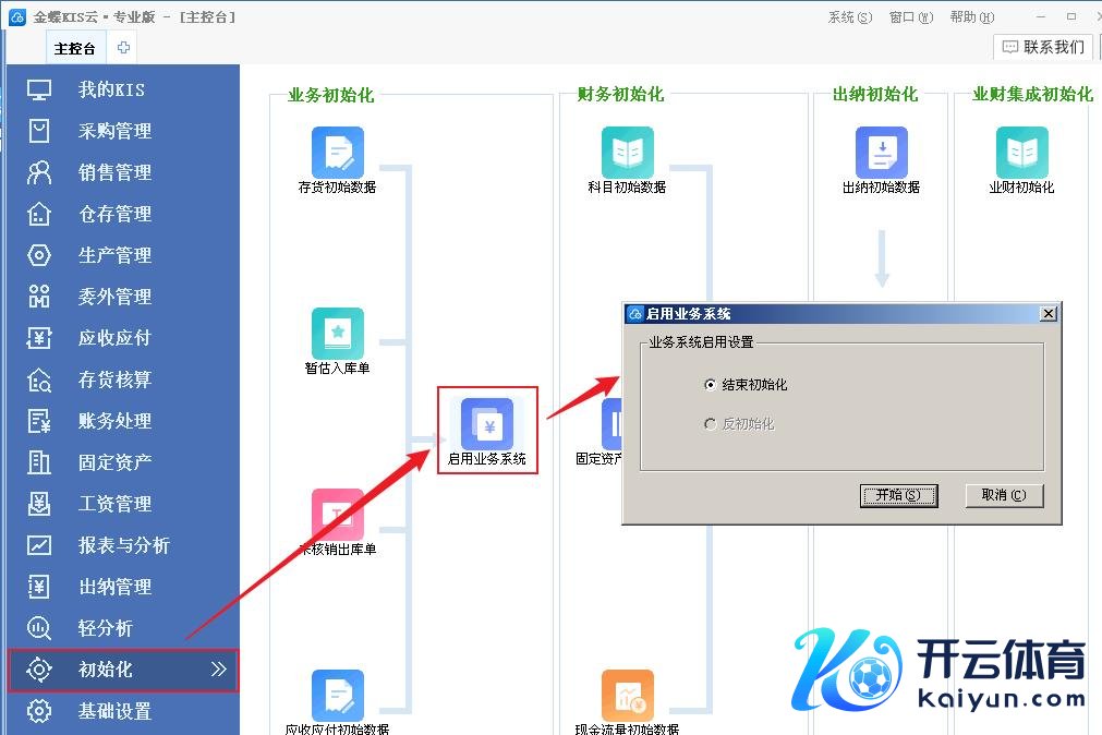 在“金蝶KIS云·专科版”主界面,采用【驱动化】→【启用业务系统】,干预【启用业务系统】界面进行操作。要是有不妥贴条款的情形出现(启用期前的票据未经过审核),系统会赐与有关请示。